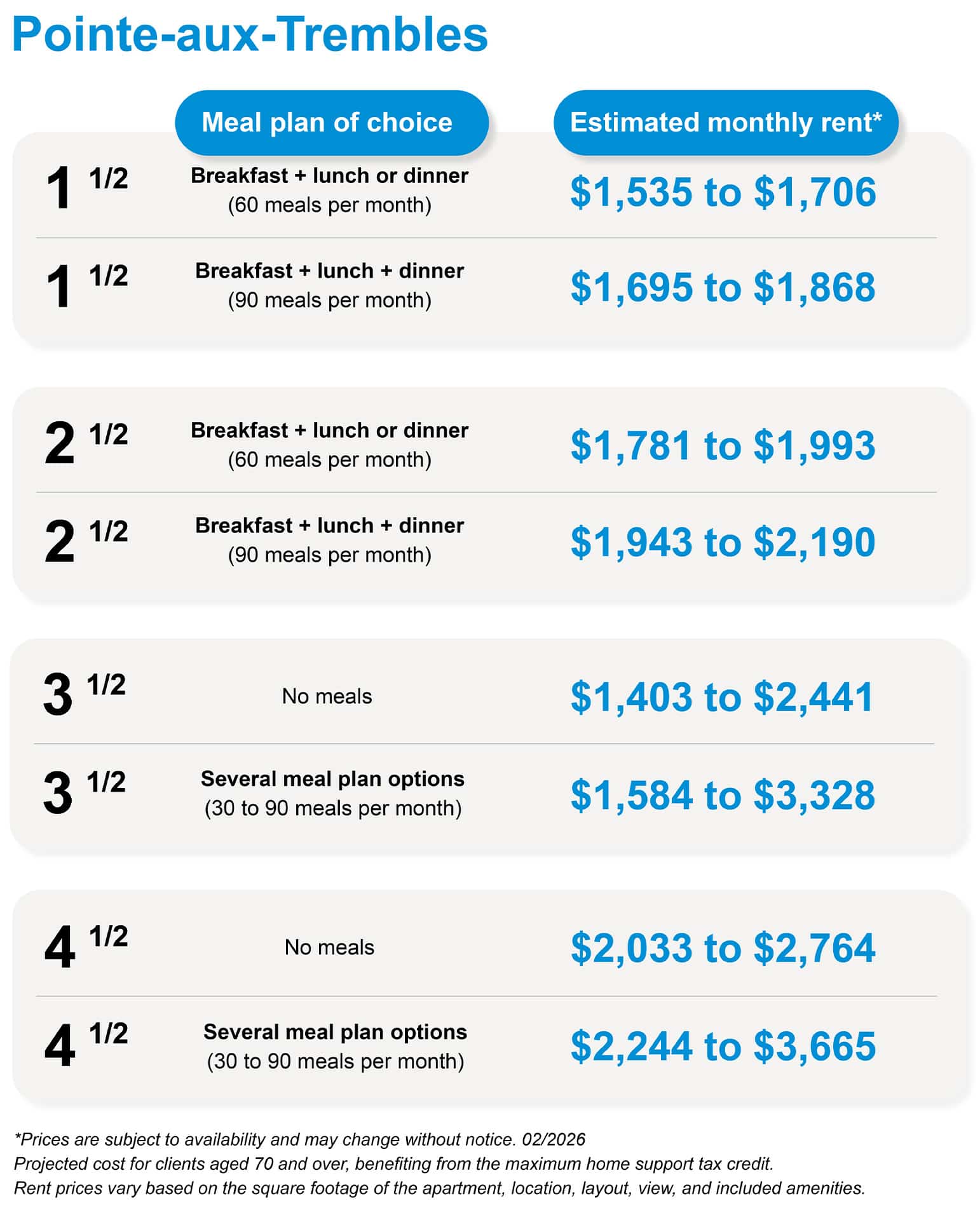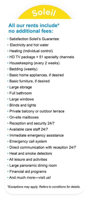 *Prices “Starting at”, according to availability and subject to change without notice. Real cost projection for a resident, aged 70 years or more, benefiting from the maximum tax credit for home support.
