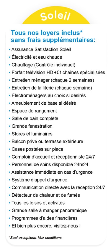 *Les loisirs, activités et fêtes proposés à la résidence sont tous inclus gratuitement, à l’exception de certaines sorties, du bingo, de certains cours et de concerts spéciaux. Les espaces communs de la résidence font partie du domicile de nos résidents et sont accessibles 24/7.
