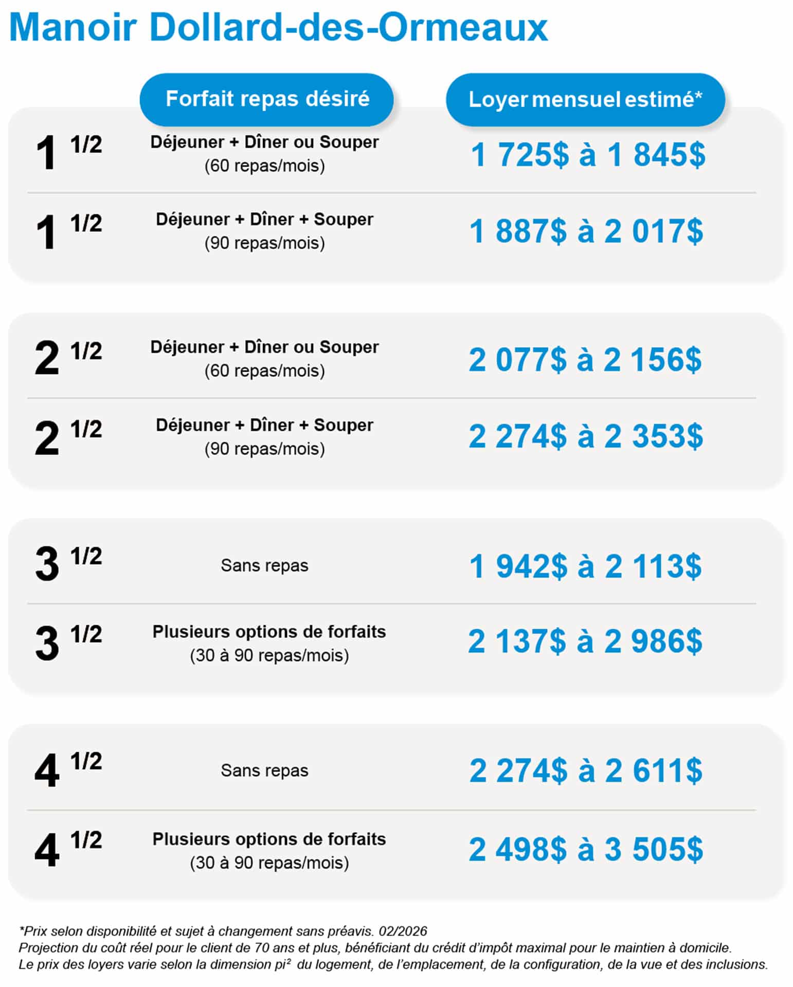 Les Résidences Soleil Manoir Dollard-des-Ormeaux offre plusieurs types de logements par grandeur : studio 1 ½, 2 ½, 3 ½, 4 ½