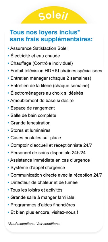 *Les loisirs, activités et fêtes proposés à la résidence sont tous inclus gratuitement, à l’exception de certaines sorties, du bingo, de certains cours et de concerts spéciaux. Les espaces communs de la résidence font partie du domicile de nos résidents et sont accessibles 24/7.