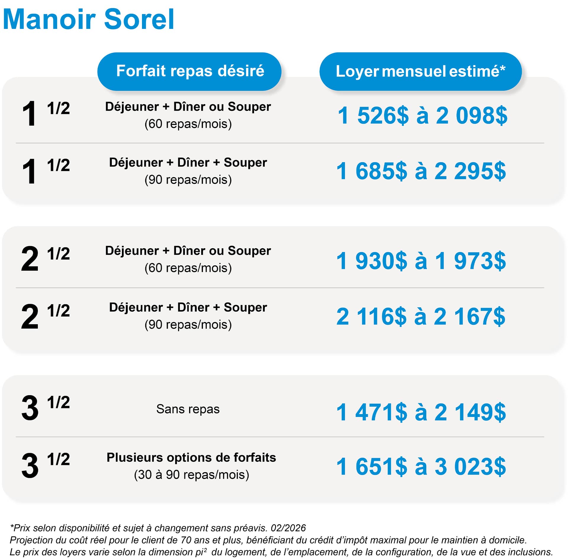 Les Résidences Soleil Manoir Sorel offre un vaste choix d’appartements, pour les 65 ans et plus, dont des studios 1 ½, 2 ½ et 3 ½ de différentes dimensions (pi2) et configurations ainsi que quelques appartements d’exception.