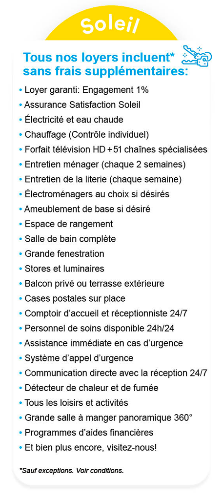 Par exemple : Si vous avez 70 ans et plus, vous pourriez recevoir jusqu’à 2 180$/mois, directement dans vos poches ! Contactez dès maintenant nos conseillers en hébergement. Ils vous aideront gratuitement à obtenir toutes les prestations auxquelles vous avez droit en tant que résident chez nous.