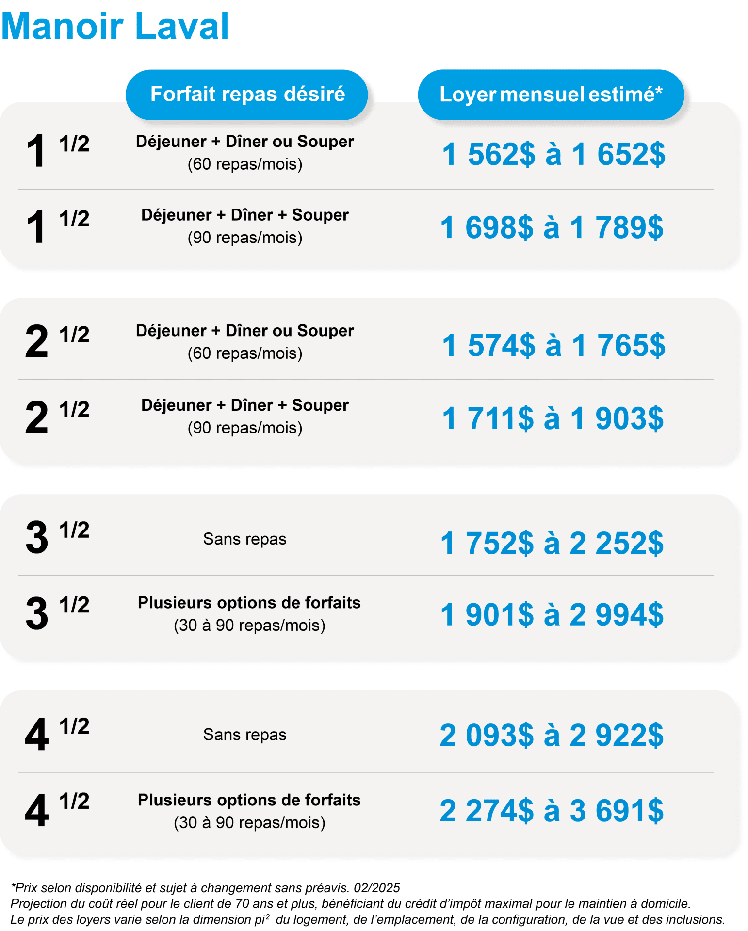 Les Résidences Soleil Manoir Laval offre plusieurs types de logements par grandeur : studio 1 ½, 2 ½, 3 ½, 4 ½ et quelques appartements d’exception.