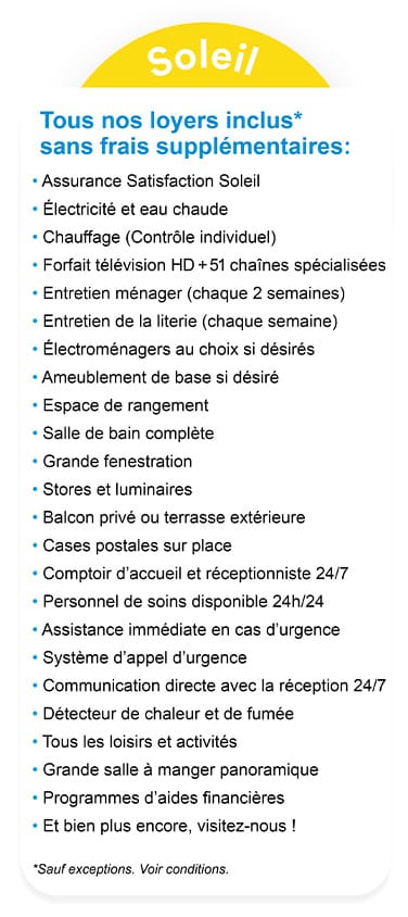*Les loisirs, activités et fêtes proposés à la résidence sont tous inclus gratuitement, à l’exception de certaines sorties, du bingo, de certains cours et de concerts spéciaux. Les espaces communs de la résidence font partie du domicile de nos résidents et sont accessibles 24/7.