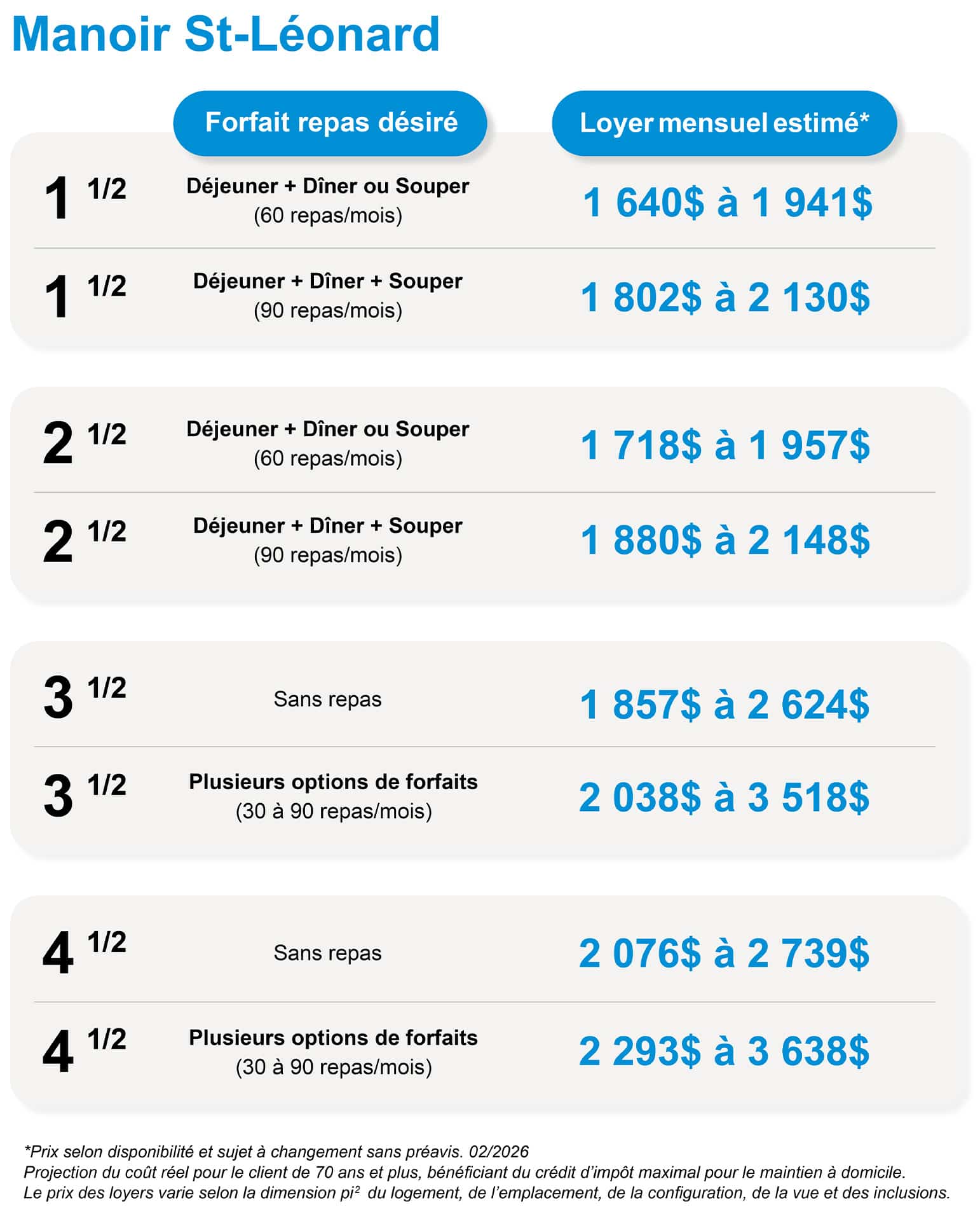 Les Résidences Soleil Manoir St-Léonard offre un vaste choix d’appartements, pour les 65 ans et plus, dont des studios 1 ½, 2 ½, 3 ½, 4 ½ de différentes dimensions (pi2) et configurations ainsi que quelques appartements d’exception.