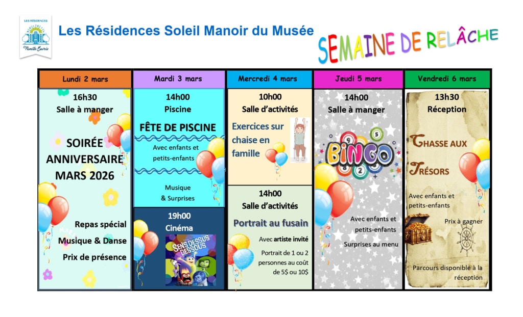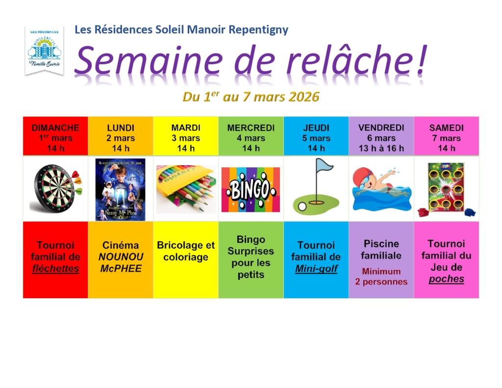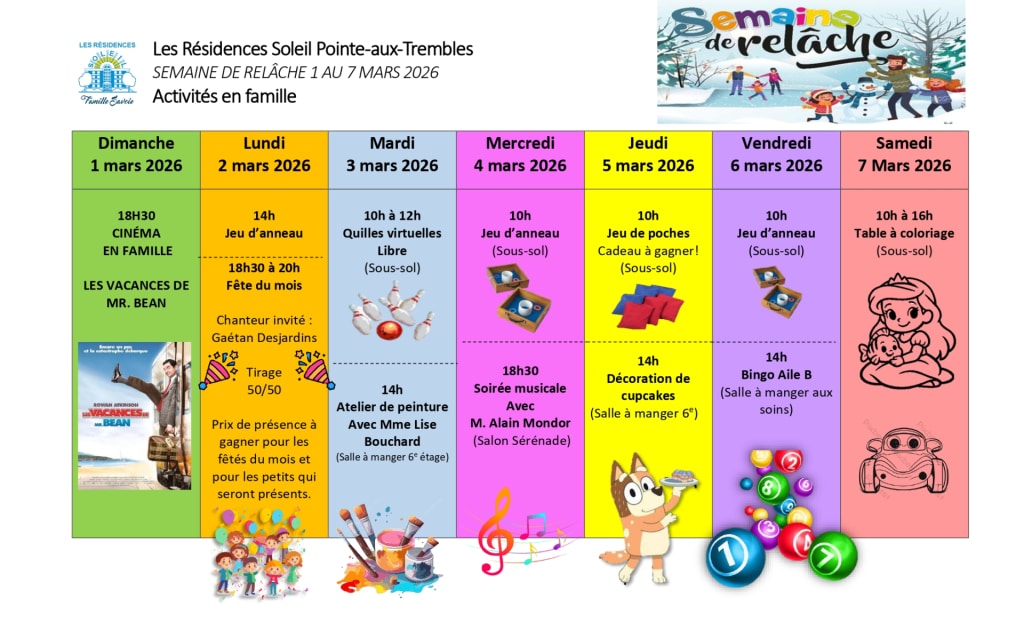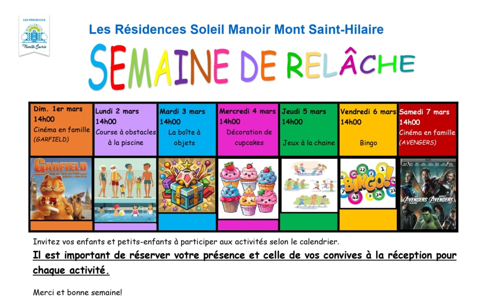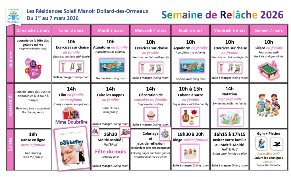 Venez vivre une Semaine de relâche intergénérationnelle en famille  ! Dans chacune de nos 15 Résidences Soleil à travers le Québec, une programmation festive et amusante est proposée, spécialement conçue pour tous les âges.