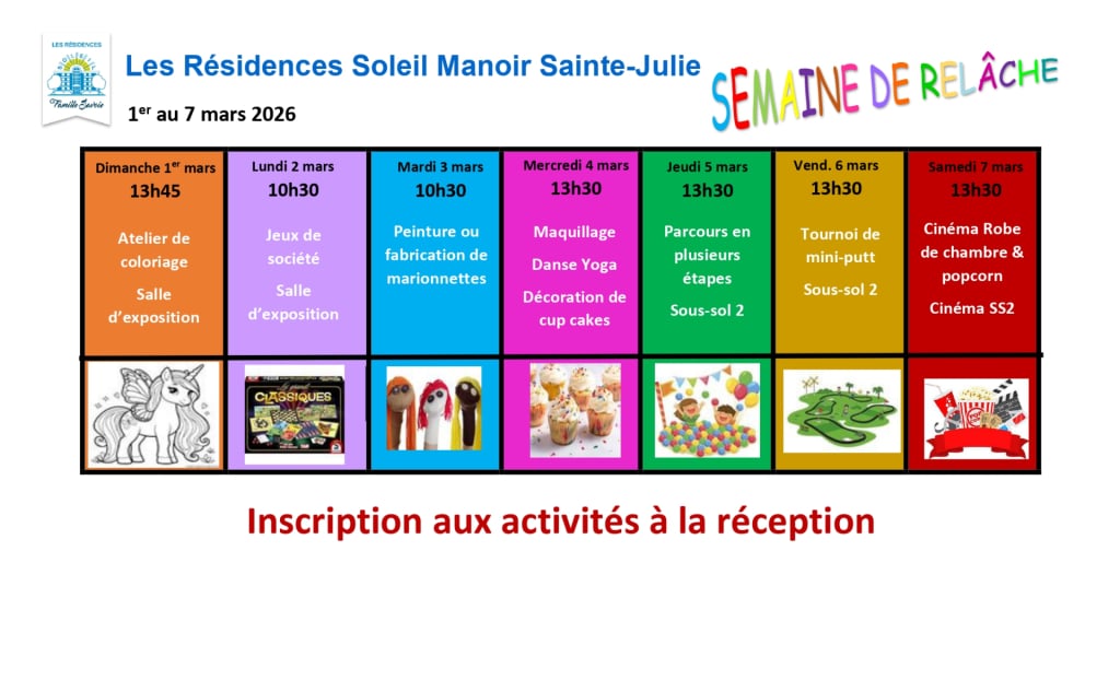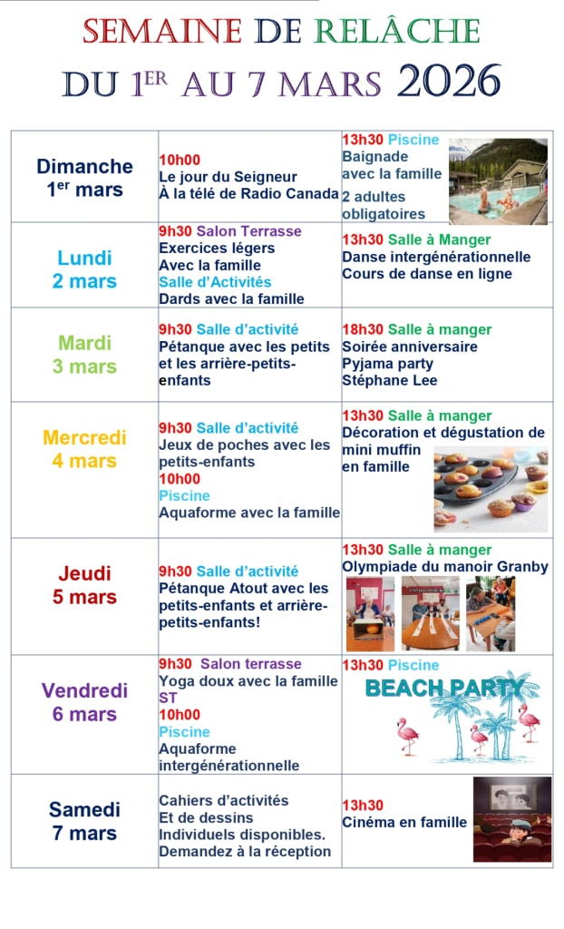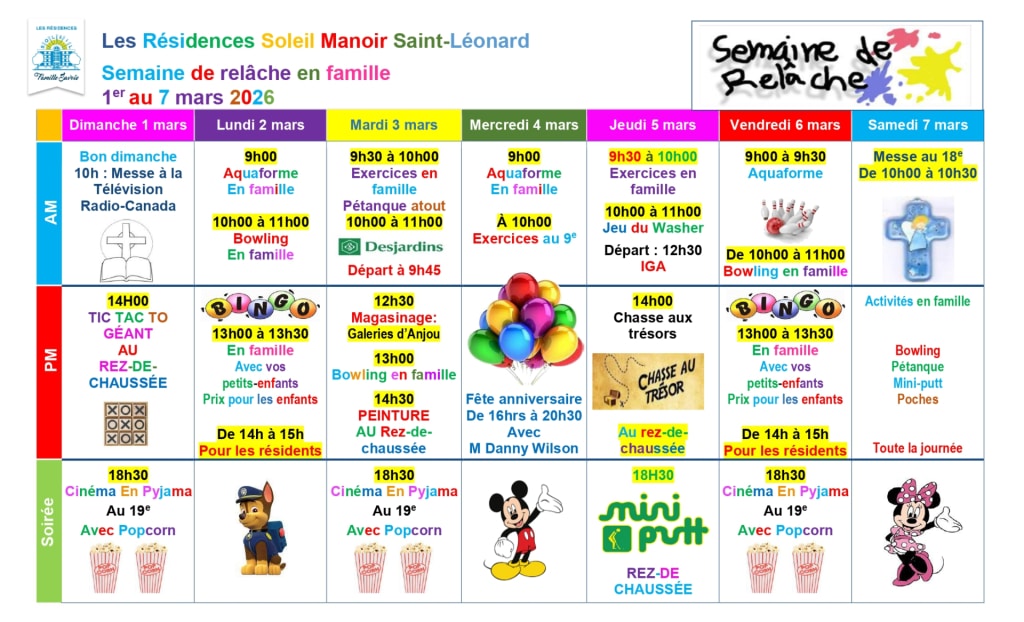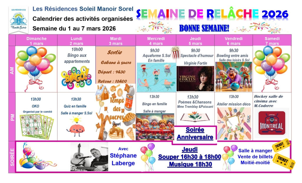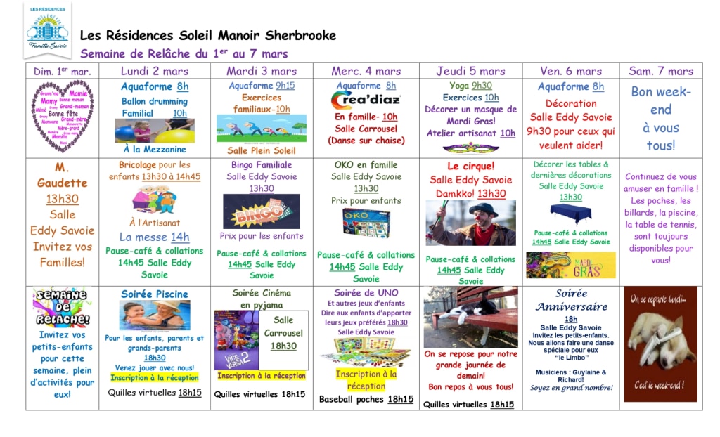 Venez vivre une Semaine de relâche intergénérationnelle en famille  ! Dans chacune de nos 15 Résidences Soleil à travers le Québec, une programmation festive et amusante est proposée, spécialement conçue pour tous les âges.