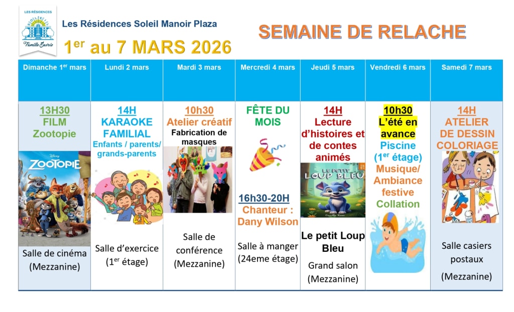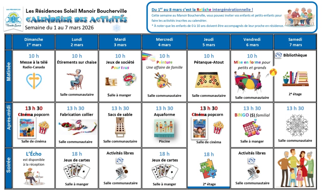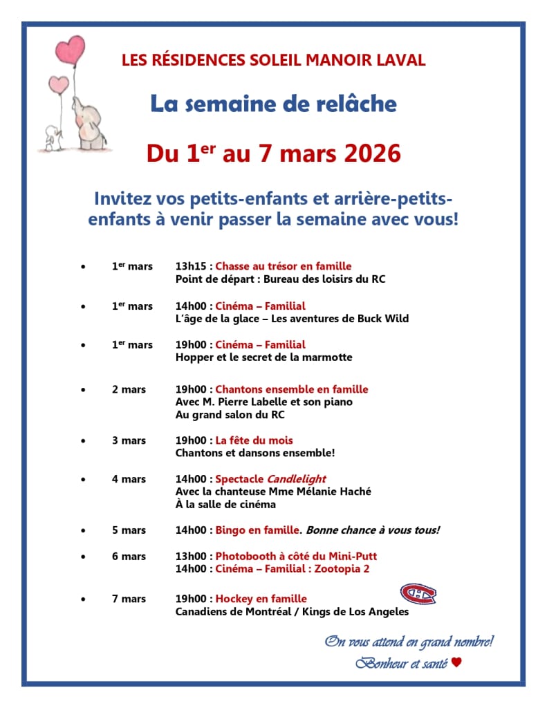 Du 1er au 8 mars, venez profiter de La Semaine de relâche intergénérationnelle qui se déroulera dans toutes Les Résidences Soleil à travers le Québec ! Joignez-vous à nous pour une semaine de purs plaisirs et de moments en famille qui font chaque année le bonheur de tous !